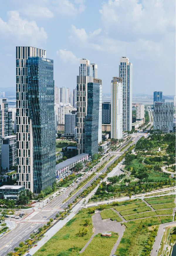 Songdo International Business District (Songdo IBD) is a smart city or "ubiquitous city" built from scratch on 600 hectares (1,500 acres) of reclaimed land along Incheon's waterfront, 30 kilometers southwest of Seoul, South Korea and connected to Incheon International Airport by a 12.3-kilometre reinforced concrete highway bridge, called Incheon Bridge. Along with Yeongjong and Cheongna, it is part of the Incheon Free Economic Zone.